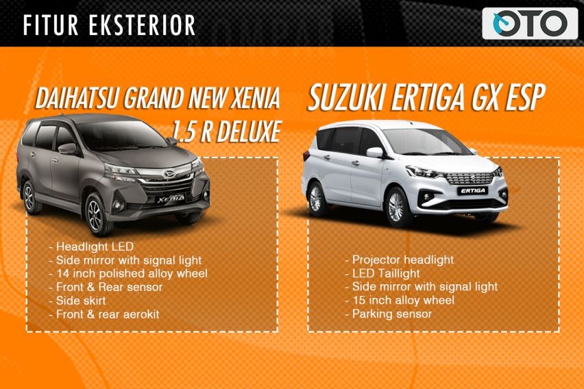 Grand New Daihatsu Xenia 1.5 R Deluxe punya banyak peningkatan. Ini karena Daihatsu berani memberikan fitur standar yang komplet untuk semua Xenia. Dimulai dari eksterior, Xenia 1.5 punya lampu depan LED. Di sisi lain, Suzuki Ertiga GX punya lampu depan dengan proyektor, yang penerangannya bisa lebih presisi meski bohlamnya masih halogen.