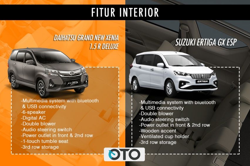 Di kabin, Ertiga dan Xenia mengadopsi dashboard dua warna. Tapi milik Ertiga lebih terlihat mewah karena imbuhan aksen kayu, termasuk di setir. Urusan sistem multimedia, dapat dibilang berimbang. Sama-sama mengandalkan layar sentuh dan bisa dikendalikan dari kemudi. Keduanya pun punya kemampuan konektivitas dengan Bluetooth untuk menyambungkan telepon genggam.