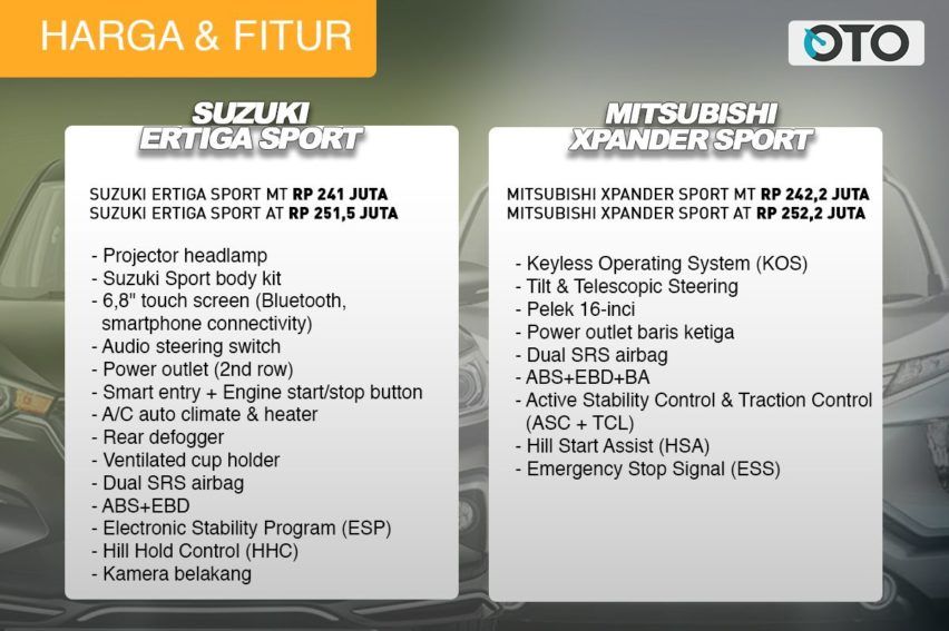 Keduanya punya harga terpaut tipis. Makanya sangat cocok dibandingkan, selain sama-sama menyandang emblem sport. Xpander Sport bukan tipe tertinggi, ada Ultimate dengan harga lebih mahal sekitar Rp 8 juta. Sehingga ada pengurangan fitur dibanding Ultimate, seperti tidak dapat head unit monitor, cruise control dan beberapa detail lain. Tapi fitur keselamatannya tetap sama dengan Ultimate. Kontrol stabilitas dan Hill Start Assist (HSA) tersedia untuk mendukung keamanan berkendara. Keunggulan fitur Xpander Sport yang tidak ada di Ertiga Sport adalah telescopic steering. Mencari posisi mengemudi sempurna lebih mudah didapat.