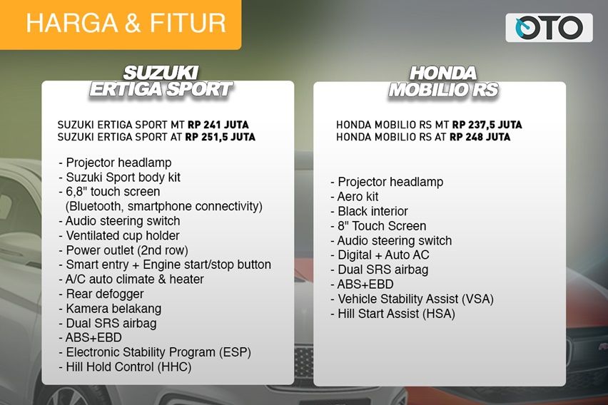 Ertiga Sport dibanderol sedikit lebih mahal. Tak banyak, tapi menunjukkan value for money tinggi untuk Mobilio RS. Fitur keduanya hampir sama. Namun Mobilio RS punya beberapa keunggulan. Untuk versi terbaru kali ini, sudah mendapat head unit layar sentuh ukuran 8-inci. Monitor ini juga ditemui di beberapa model facelift lain: HR-V, Jazz dan City. Karena ukuran layar dan bingkai kurang sesuai, dibuatlah desain seolah mengambang. Memiliki fungsi standar seperti koneksi iPod dan iPhone, Bluetooth, koneksi smartphone dan USB port.