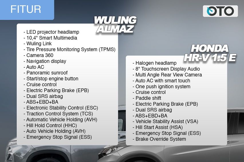 Membandingkan harga keduanya, HR-V 1.5 E menjadi sangat mahal. Lampu depan masih halogen dan headunit monitor 8-inci kalah besar dari Almaz. AC digital dengan Smart Touch pun kalah mutakhir. Namun varian ini sudah menawarkan fitur keselamatan standar sangat mencukupi. Sebut saja dual airbag, ABS+EBD+BA, Vehicle Stability Assist (VSA), Hill Start Assist (HAS), brake override system dan Emergency Stop Signal (ESS).