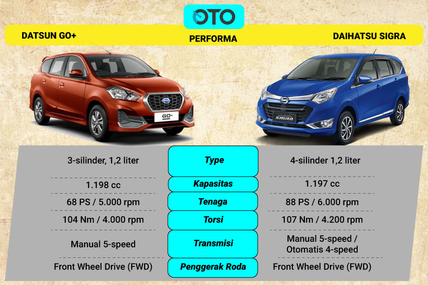 GO+ 2018 masih memakai mesin yang sama seperti Datsun lama, 3-silinder 1,2 liter bertenaga 68 PS pada 5.000 rpm dan torsi puncak 104 Nm pada 4.000 rpm. Sementara Sigra, mesinnya 4-silinder 1,2 liter berdaya 88 PS pada 6.000 rpm dan torsi maksimal 107 Nm pada 4.200 rpm. Dari segi output GO+ sudah ketinggalan, belum lagi GO+ masih 3-silinder yang noise dan getarannya lebih terasa ketimbang mesin 4-silinder. Itu tentu mempengaruhi kenyamanan penumpang di kabin GO+ meski Datsun mengatakan, sudah meningkatkan kadar kekedapan kabin dibanding GO+ lama. Pilihan transmisi sudah jelas, Sigra lebih unggul karena menawarkan opsi otomatis 4-speed. Andai GO+ jadi dibekali dengan X-Tronic CVT, pasti daya saingnya meningkat drastis.