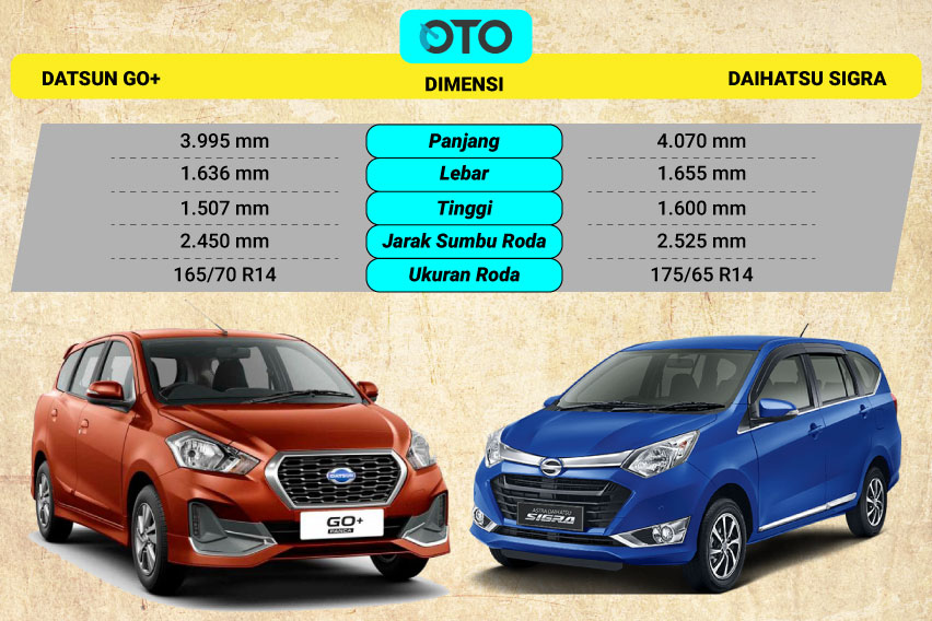 Datsun GO+ 2018 sebetulnya cuma penyegaran pada sektor desain dan fitur dari GO+ lama. Jadi soal dimensi dan ukuran masih sama. Dimensinya 3.995 x 1.636 x 1.507 mm (PxLxT) dan jarak sumbu roda 2.450 mm. Sigra punya ukuran lebih besar dengan panjang 4.070 mm, lebar 1.655 mm dan 1.600 mm untuk tinggi. Sedang jarak antar poros roda Sigra 2.525 mm. Selain bodi lebih besar, kabin Sigra juga lebih lapang berkat jarak sumbu roda yang lebih panjang ketimbang GO+.