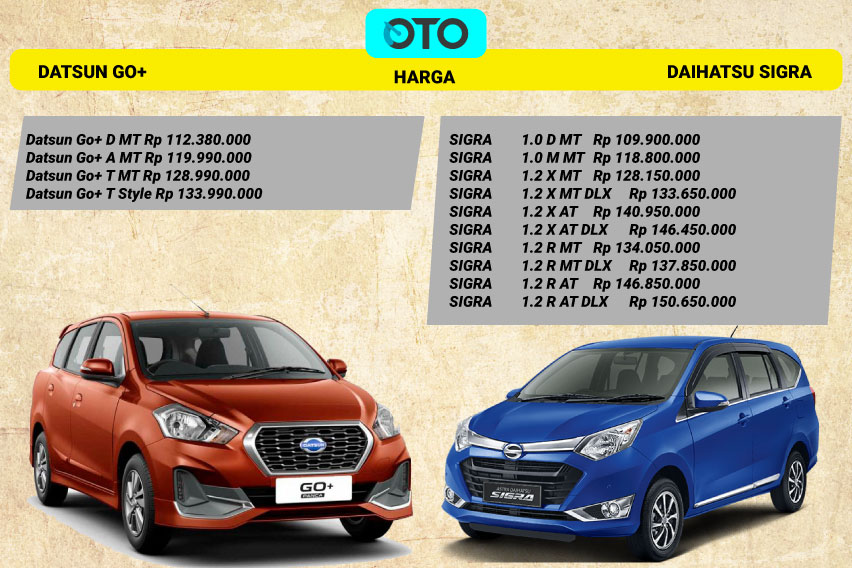 Datsun GO+ terbaru ditawarkan di rentang harga Rp 112,38 - 133,99 juta dengan empat varian. Sementara Sigra punya banyak varian, tepatnya 10 dengan dua yang termurah memakai mesin 1.0 L dan sisanya pembeda pada kelengkapan fitur. Harga Daihatsu Sigra mulai dari Rp 109,9 - Rp 150,65 juta. Kalau dilihat memang Sigra lebih mahal. Sebabnya, Sigra punya pilihan transmisi otomatis. Kalau melihat Sigra manual paling mahal 1.2 R MT Deluxe Rp 137,85. Seandainya Datsun membekali GO+ dengan CVT, rentang harganya bisa berada di kisaran yang hampir sama dengan Sigra.