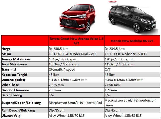 Harga & Varian Kami membawa varian tertinggi dari Avanza dan Mobilio ke dalam komparasi ini, Mobilio RS CVT dan Avanza Veloz A/T. Ternyata harga keduanya hanya berbeda sedikit. Mobilio RS bertransmisi otomatis dijual dengan harga Rp 234,5 juta (OTR Jakarta). Sedangkan Toyota Great New Avanza Veloz A/T dijual di Jakarta dengan harga Rp 230,5 juta.