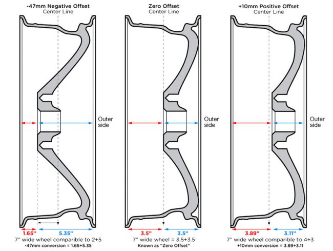 Bagaimana dengan istilah offset? Ya, istilah tersebut juga terkait dengan angka, walaupun bagi segelintir orang melihatnya lebih kepada selera desain. Istilah offset dapat didefinisikan sebagai lekukan atau tonjolan pada bagian tengah pelek. Posisi tengah dari center line atau pelek standar disebut dengan nol, sementara semaking cekung disebut dengan negatif (-) dan positif (+) untuk tonjolan keluar. Semakin besar angka negatif, semakin dalam legok pada pelek, sebaliknya pada positif akan semakin menjorok ke luar bagian permukaan tengahnya. Offset sering juga ditandari dengan ET (dari singkatan kata bahasa Jerman, Einpresstiefe).