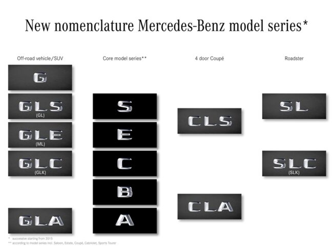 Nama dan penentuan strata bakal membingungkan ketika produk semakin banyak. Seperti langkah di pertengahan 1990-an, bak merapikan tumpukan dokumen agar lebih tertata. Sehingga saat itu keluarga sedan terbagi atas C-Class, E-Class, dan S-Class. Kembali terjadi di 2013. Diumumkan saat SUV mulai booming dan Mercedes merencanakan bakal banyak produk berdatangan.