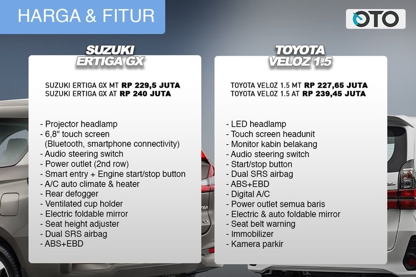 Kedua mobil punya banderol terpaut tipis. Makanya sangat pas disandingkan satu sama lain. Dari harga yang harus dibayar, pembeli sudah bisa mendapat banyak kelengkapan sebagai varian atas. Setidaknya fitur mereka berimbang. Ada yang hanya dimiliki Ertiga GX, begitu pula sebaiknya. Veloz dan Avanza sangat membanggakan lampu utama LED yang standar di semua tipe. Adanya lampu hemat energi mudah ditebak, setelah Rush generasi baru diguyur seabrek fitur. Sayang 6 airbag dan electronic stability control serta hill start assist tidak diikutsertakan.