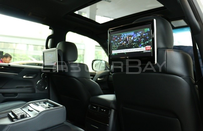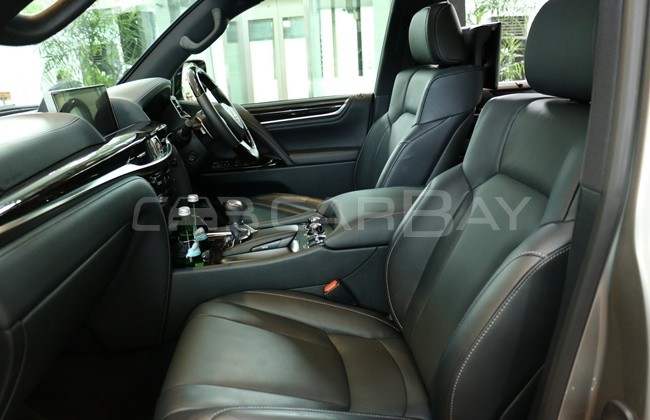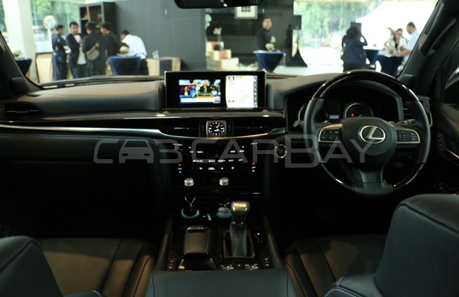 Bergeser ke interior, kabin LX570 dijejali beragam fitur berkelas seperti layar multimedia 12.3 inci yang terintegrasi navigasi dengan peta Indonesia dan panorama view camera di tengah dashboard, head-up display berwarna dan berisi informasi berkendara yang ditembakkan ke kaca depan, dua buah layar hiburan 11.6 inci yang tertanam di balik head rest bangku baris pertama yang ditujukan untuk memanjakan penumpang dibelakang, armrest di kursi baris kedua yang dilengkapi pengendali pendingin udara dan pengatur audio, wireless charging, Lexus Climate Concierge yang bisa mengontrol otomatis temperatur di kabin dan dilengkapi total 19 speaker dari sistem tatanan audio ternama Mark Levinson.