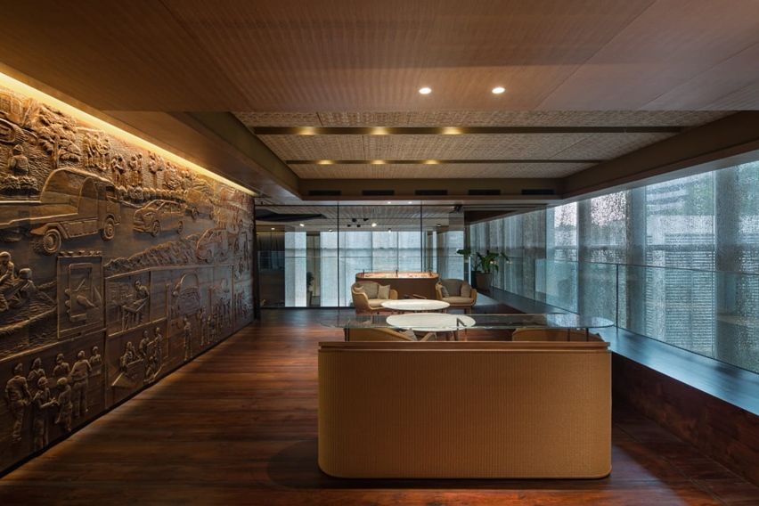Anyaman rotan yang merupakan produk alami, juga dipasangkan di plafon showroom. Ini berbentuk ornamen dalam berbagai motif yang diadopsi dari corak khas Indonesia. Penggunaan bahan eco friendly, tampak pada bagian tengah showroom yang disisipi ukiran berbahan kayu jati daur ulang.