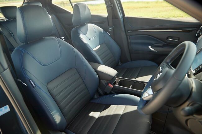 Kabin Kicks e-Power Autech juga punya tampilan eksklusif, Berupa aksen jahitan biru di area dashboard. Aksen sama tampak pula di trim jok berlapis kulit, yang memadukan warna hitam serta biru gelap. Emblem Autech turut terpasang di interior, tepatnya di dekat tuas transmisi bernuansa piano black.