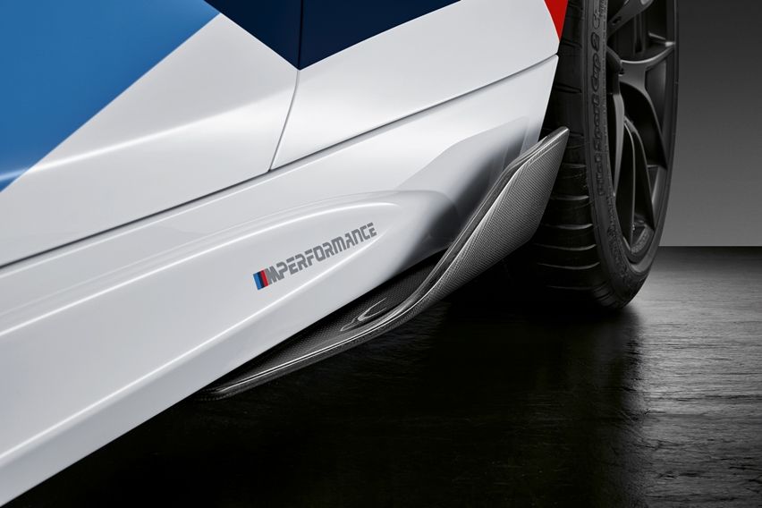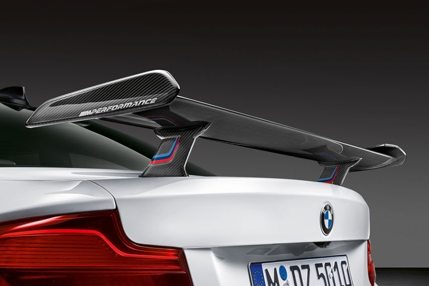Wajah M2 Competition makin garang dengan nuansa bespoke yang kental melalui pemasangan perangkat M Performance carbon front splitter. Ia dijual seharga Rp 33,63 juta. Decal dinamis juga tersedia, yang disebut M Performance motorsport foil yang berupa tiga warna khas BMW : merah, biru tua dan muda. Ia dipatok Rp 5,69 juta. Ini dipadukan side sill film terbuat dari karbon fiber, yang terpasang di skirt samping, dibanderol Rp 37,14 juta. Rumah spion samping ditingkatkan tampilannya dengan bahan karbon. Untuk sepasangnya, BMW mematok Rp 17,43 juta.