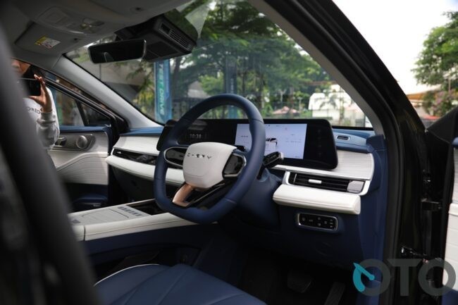 Beralih ke bagian dalam, desainnya juga masih mirip dengan Omoda 5 biasa. Paling mencolok adalah penggunaan skema warna. Omoda E5 menggunakan warna biru dan putih untuk bagian kabin. Selain itu, Chery juga menyiapkan warna dasar hitam bagi yang kurang tertarik dengan warna menyala itu tadi. Bagian jok dan sejumlah titik berlapis kulit. Bagian panel juga ada yang bermotif kayu. Hanya motif, bukan kayu asli.