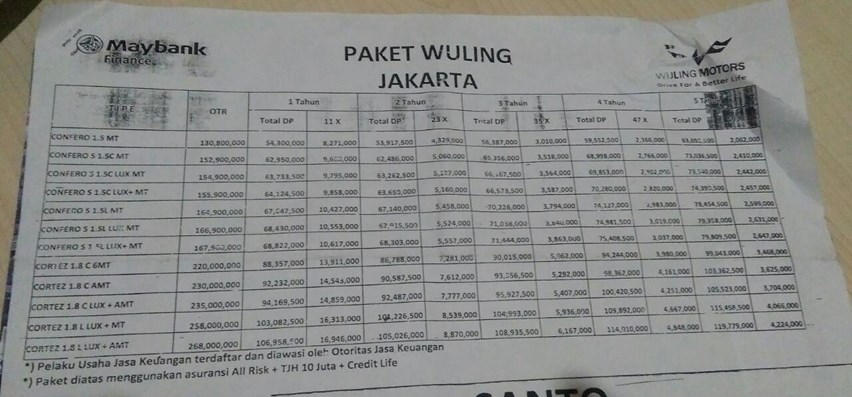 Daftar cicilan ini kami dapatkan dari wiraniaga Wuling yang beroperasi di Mal Kota Kasablanka. Dari skema cicilan yang diberikan, tertulis Maybank Finance sebagai lembaga finansial pemberi kuasa kredit. Tentunya, asuransi all risk sudah menjadi basis preminya.