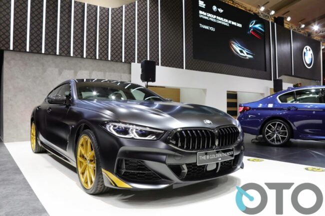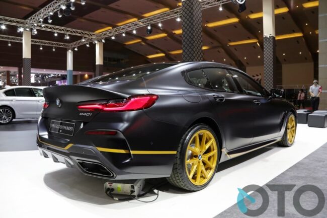 BMW 8 Series hadir dalam penampilan istimewa di IIMS Hybrid 2021. Tubuh moleknya disudahi komposisi pemanis bertajuk Golden Thunder Edition. Sukses menguatkan aura gahar di atas rancangan elegan. Eksklusif, hanya tersedia satu unit dalam format 840i Gran Coupe.