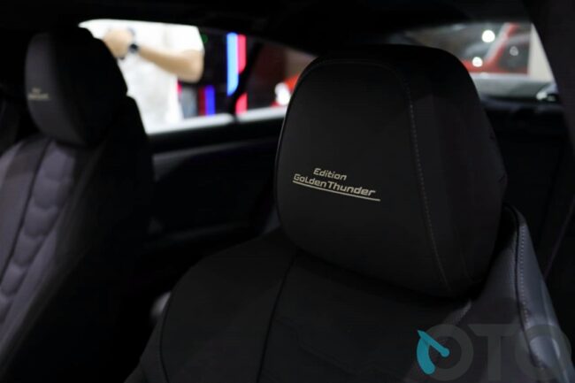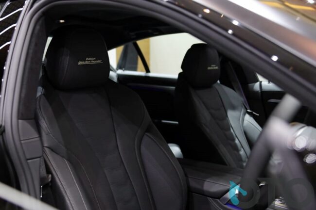 Tema senada tentu tertuang sampai ke dalam kabin. Mewah sudah pasti, mengusung material jok Merino Leather gelap dari BMW Individual dan headliner Alcantara Antrachite. Menegaskan spesies istimewa, bagian head rest dibordir dengan teks Golden Thunder Edition. Di samping itu, finishing ornamen interior mengusung panel Aluminium Mesh Effect Gold berikut terpampang emblem edisi khusus pada penutup center console.