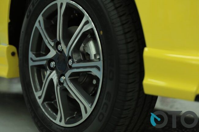 Ayla juga punya sepatu baru. Pelek palang kipas sedikit dipermak dengan aksen two tone di tengah palang. Cukup menambah kesan atraktif. Tapi soal ukuran sama saja, memiliki profil 175/65 R14.