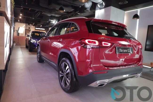 Yep, cladding hitam memberikan sensasi ‘rugged’ dalam siluetnya yang membulat. Ornamen lain turut menghiasi bawahan GLA. Seperti dagu ala skid plate kromium mengilap di depan dan belakang. Melirik bokong, terdapat dua lubang knalpot rasa sporty. Hanya rasa, bukan kenyataan lantaran melekat sebagai hiasan.