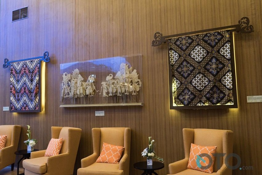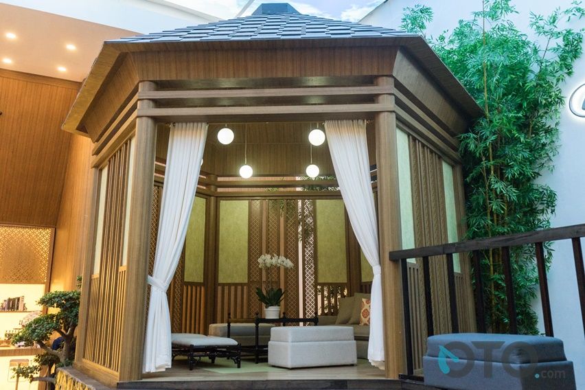 Pada bagian dalam booth, ada sebuah hospitality termewah yang kami lihat di GIIAS. Namanya Imperial Garden Lounge. Area ini mungkin merupakan ruang termewah yang ada di wilayah ICE BSD. Ruangan dengan tinggi 7 meter, dihiasi nuansa langit, kolam pasir dan batu (zen garden) yang ditata sangat apik. Tak lupa, karya seni dari seniman Indonesia dipajang; kain batik hingga lukisan kolase menghias sudut-sudut lounge.