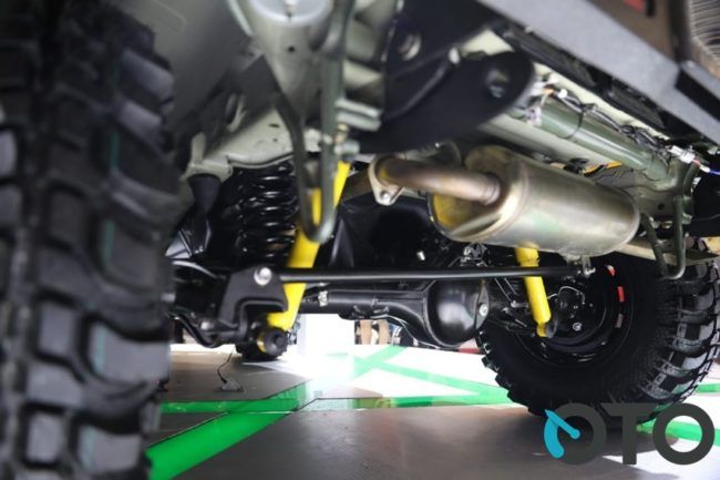 Kaki juga ikut dirombak. Di depan maupun belakang, memakai model 3-link rigid axle dengan Coil spring serta shock absorber merek Old Man Emu. Kelihatannya, ditambahkan sedikit lifter lagi sampai tingginya bisa begitu.