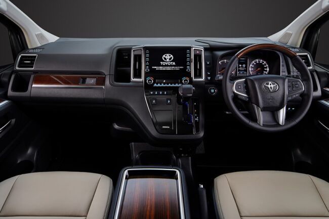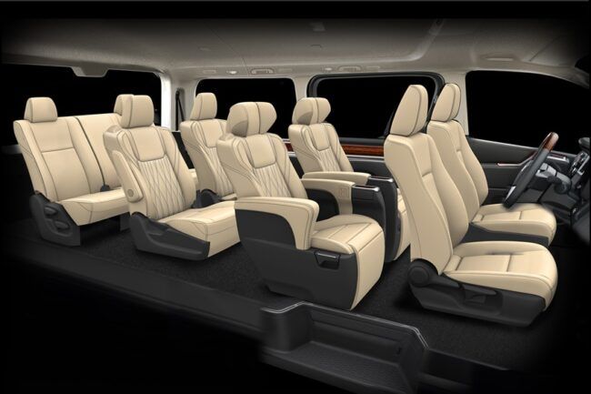 Melihat isi kabin, jelas terpampang kodratnya sebagai kendaraan pengangkut penumpang rasa kelas bisnis. Toyota memberikan opsi konfigurasi bangku tiga-baris enam penumpang, atau empat-baris delapan penumpang. Tersedia Captain seat di baris dua dan tiga. Duduk di kursi ini tampak nyaman berkat headrest tebal serta fitur mekanisme ottoman untuk sandaran kaki. Atmosfer berkelas diraih berkat perpaduan warna hitam dan krem serta dekorasi kayu.