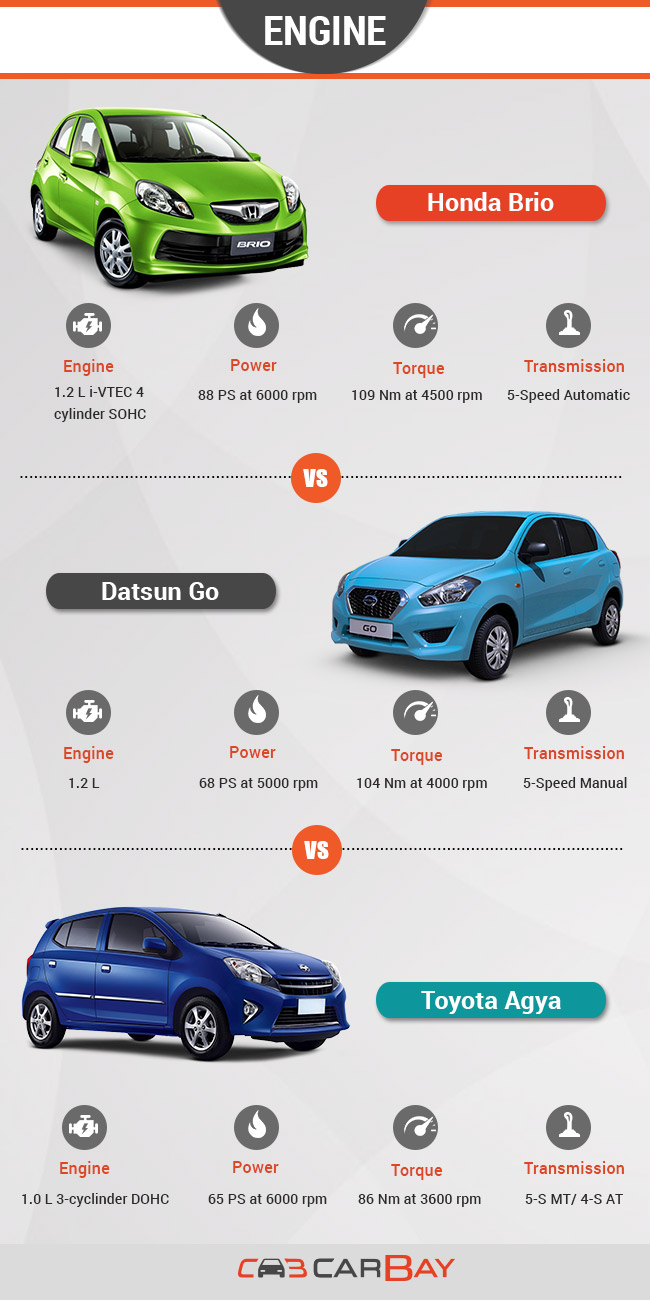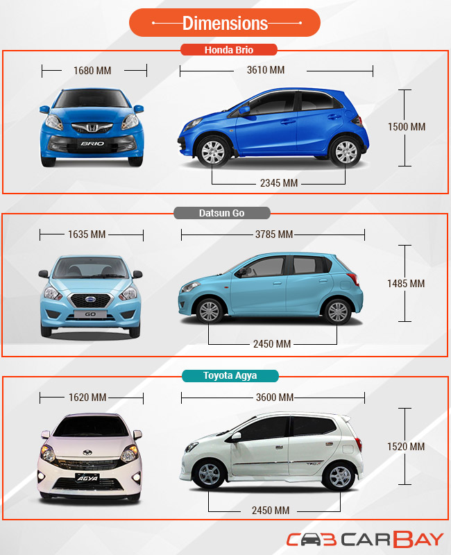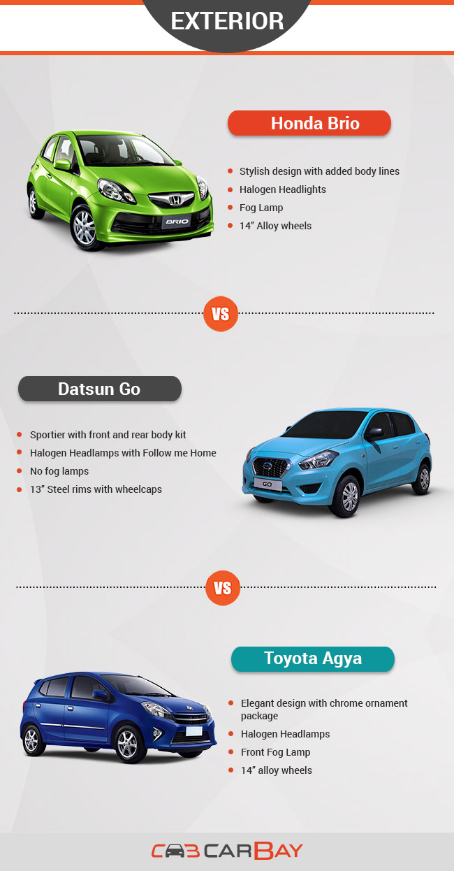 Mobil yang memimpin dalam segmen compact car adalah Honda Brio, Datsun Go, dan Toyota Agya. Terdapat banyak nama lain yang termasuk dalam segmen ini, namun nama-nama tersebut merupakan nama yang paling populer, dan kami memutuskan untuk membahas lebih lanjut dengan mobil mereka. Semua dapat memberikan Anda kenyamanan terbaik yang bisa ditawarkan, mengingat adanya batasan harga. Dari roda alloy hingga sensor parkir, dan dari berkendara dengan gembira hingga memastikan keselamatan Anda dalam jangkauan, banyak hal telah dimasukkan ke dalam mobil-mobil ini dengan memperhatikan permintaan pasar. Para penggemar teknologi akan menyukai Datsun Go, karena memiliki teknologi pengereman yang lebih baik, sensor parkir yang terpasang, lampu depan Follow Me Home, dan interior yang lebih bagus diantara fitur-fitur lainnya, sementara tampilan Toyota Agya jauh lebih sporty terlihat dari aero kit pada bagian depan dan belakang serta tonjolan badan samping. Baiklah, mari kita lihat bersama.