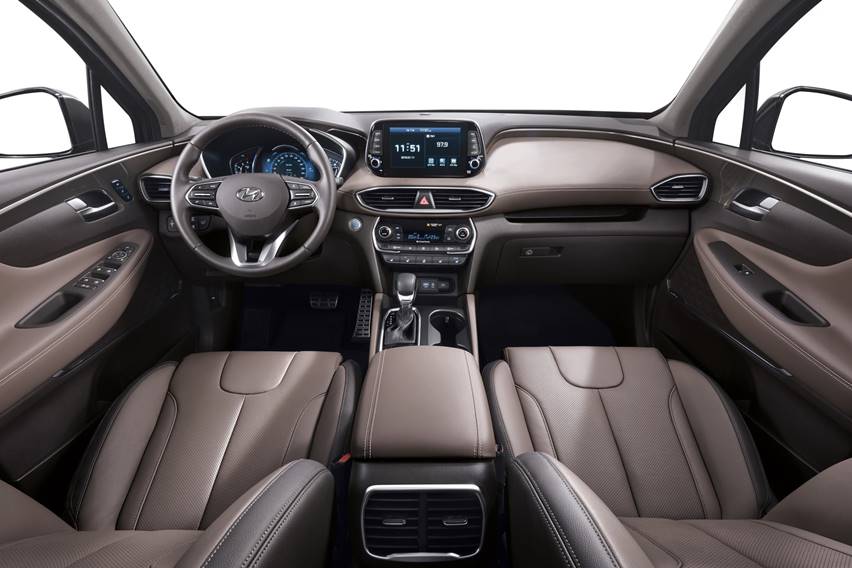 Hyundai mengklaim, kabin SUV ini memiliki fungsi yang sangat berkaitan dengan desain. Layout horizontalnya diklaim memberikan kelegaan bidang pandang ke depan. Tapi kelemahan Santa Fe, ruang pandang ke belakang yang terasa pas-pasan, kini diperbaiki dengan kaca belakang yang lebih besar.