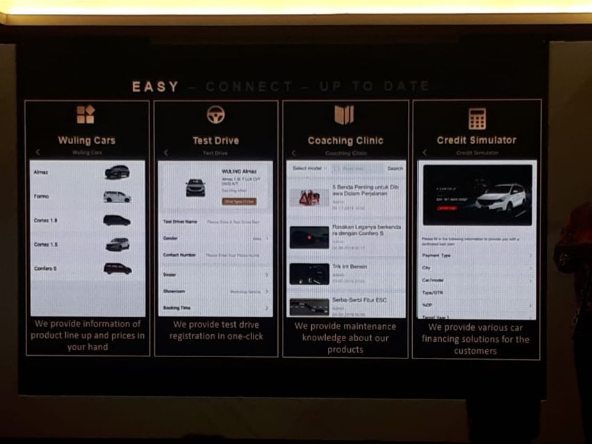 pembelian mobil juga dimudahkan lewat aplikasi ini. Berbagai informasi terkait model Wuling disediakan lengkap, mulai dari spesifikasi performa sampai fitur yang dimiliki. Pelanggan yang penasaran untuk mencoba langsung bisa melakukan pemesanan test drive. Tersedia credit simulator atau simulasi kredit. Di sini konsumen bisa mengetahui besaran cicilan yang diinginkan untuk pembelian unit.
