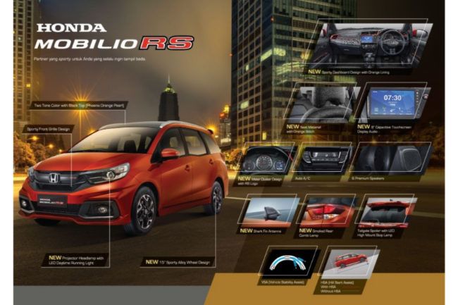Hal sama berlaku pada fitur keselamatannya dan penunjang pengendalian Honda Mobilio terbaru, antara lain vehicle stability assist dan hill start assist (untuk tipe RS), dual SRS airbag, anti-locking braking system (ABS) dan electronic brake distribution (EBD). Lantas apa saja perbedaannya? Berikut jabaran berdasarkan tipe yang ditawarkan.
