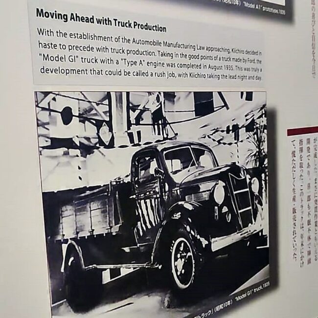 Toyota pertama kali memproduksi truk bernama Toyoda Model G1 yang kemudian juga dieksporKiichiro mewarisi sejumlah modal dari sang ayah, hasil menjual paten untuk mesin tenun kepada perusahaan Inggris. Nominalnya berkisar £100.000, sangat besar untuk kala itu. Kemudian dimanfaatkan untuk membangun divisi otomotif pada 1933 yang memang merupakan minatnya sejak lama. Ia pun membeli mobil-mobil impor rilisan Amerika Serikat (AS) yang kala itu ramai di Jepang, seperti dari merek Ford dan Chevrolet.