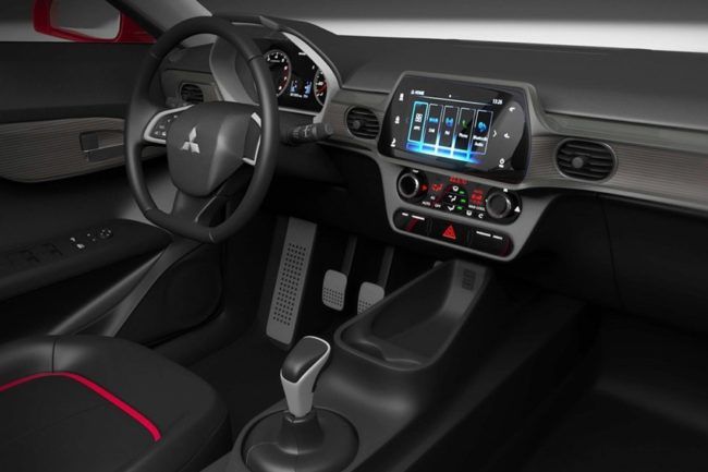 Interior kabin juga terinspirasi dari desain modern Mitsubishi. Layout lebar dan horizontal yang didominasi warna hitam. Lagi, bisa dilihat inspirasi Farkas yang mengambil dari Eclipse Cross pada interior. Seperti bagian cluster intsrumen, gagang pintu, knob tuas transmisi dan sistem infotainment layar sentuh yang dilengkapi touchpad.