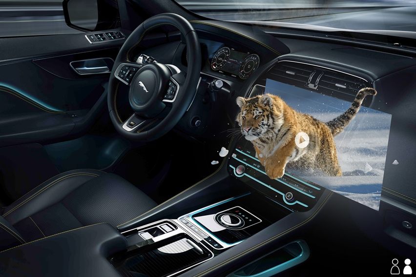 Ternyata tak cuma untuk HUD, teknologi tiga dimensi juga bisa diterapkan untuk layar hiburan dalam kabin. JLR berencana menerapkan sistem serupa untuk menghibur penumpang dengan film dari layar 3D. Sensor bakal memindai dan mendeteksi posisi kepala dan mata penumpang. Data kemudian diproses, agar bisa menghasilkan visualisasi tiga dimensi dari sudut pandang penumpang. Jadi, tak perlu menggunakan kaca mata 3D atau layar dedikasi khusus seperti di bioskop 3D.