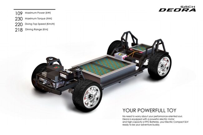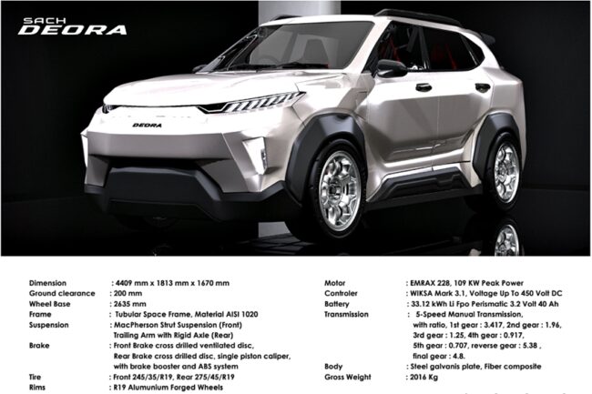 Lalu mengenai kapabilitas rancangan mobil listrik i-Deora. Konstruksi tubuh menggunakan frame turbular space dengan material AISI 1020. Suspensi depan pakai McPherson Strut dan penyangga roda belakang menggunakan trailling arim rigid axle. Kemudian pelek berukuran 19 inci alumunium forged. Total bobot mencapai 2016 kg.