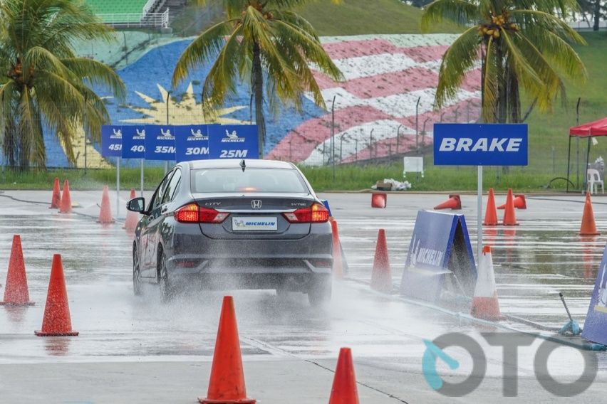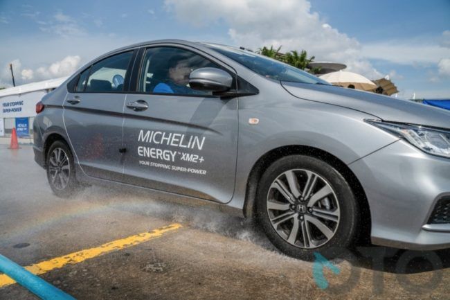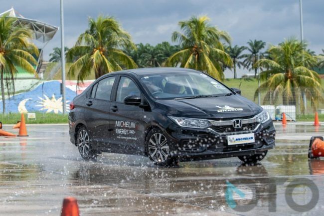 Selanjutnya kami menguji grip ke permukaan pada lintasan basah ketiganya. Bridgestone Ecopia EP300 dan Continental ComfortContact CC6 yang kami uji dalam kondisi baru. Di rintangan dalam kondisi basah, kami gagal mencatat waktu tercepat satu putaran di bawah 29 detik. Sedangkan saat mengemudikan Honda City yang memakai ban Michelin Energy XM2+ saya sanggup mencatatkan waktu 27,75. Bahkan saat menguji ban yang sudah bekasnya pun, Michelin Energy XM2+ masih sanggup membawa saya menyelesaikan satu putaran rintangan di bawah 29 detik.
