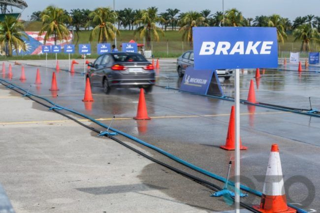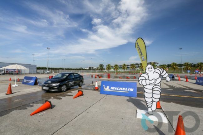 Karena bukan ban khusus mobil berperforma tinggi, kami mengujinya bukan di lintasan balap. Tapi Michelin menyiapkan dua arena dengan tantangan berbeda. Pertama area Gymkhana dan area pengereman. Kedua lintasan dalam kondisi basah dengan genangan air setinggi sekitar 5-15 mm atau kondisi jalanan yang habis diguyur hujan dengan intensitas sedang. Lintasan pertama untuk menguji kualitas grip ke permukaan jalan dan lintasan kedua untuk menguji performa pengereman.