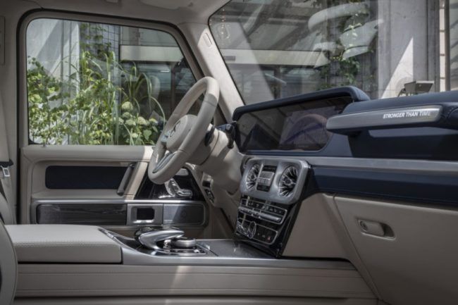 Untuk bagian dalam, edisi spesial G 63 itu menggunakan kulit Nappa berwarna two tone hitam dan Titanium Grey Pearl, dengan trim serat karbon menghiasi penjuru kabin. Seperti pada versi standarnya, G 63 Stronger Than Time juga menerapkan balutan kulit hingga ke pegangan di bagian langit-langit dan membungkus semua instrumen.