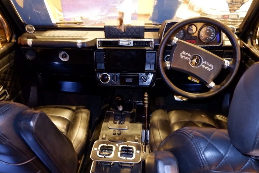 Masuk ke dalam kabin, nuansanya agak berbeda. Kesannya lebih elegan dan mewah, meski agak sedikit tangguh. Ini diwujudkan dengan mengubah seluruh pelapis interiornya dengan bahan gelap dari MBtech. Makin ketara berkat pola jahitan berlian melingkupi seluruh bagian kabin. Tak berhenti sampai di situ, Yosef turut menyisipkan barisan swarovski di beberapa area, seperti sekitaran ventilasi AC, tepian panel instrumen hingga tuas transmisi. Perhiasan itu juga terlihat di kemudi, dengan corak yang membentuk tanda panah.