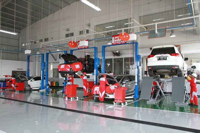 Fasilitas servis yang dimiliki di antaranya, 4 stall untuk fasilitas servis umum, 1 stall inspection line dan 2 stall Mitsubishi Quick Pit (MQP). MQP yaitu layanan service ringan dalam waktu kurang dari 60 menit khusus kendaraan penumpang, meliputi pemeriksaan umum seperti pembersihan air filter, penggantian oli kendaraan dan lainnya.