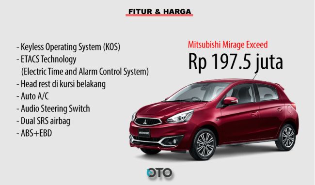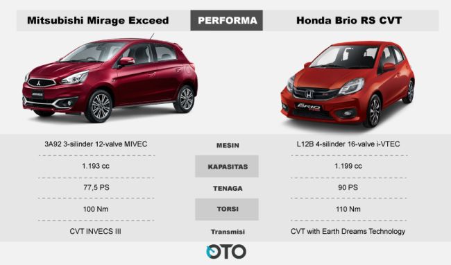Mirage yang paling cocok, bisa saja tipe GLS atau Exceed yang bertransmisi CVT juga. Sayangnya, Mirage GLS terlalu minim fitur, sehingga sulit melawan Brio RS. Tipe Exceed sebenarnya lebih tepat, walau harganya jadi berbeda cukup jauh. Tak mengapa, pertarungan menjadi lebih adil. Kira-kira mana yang lebih unggul?