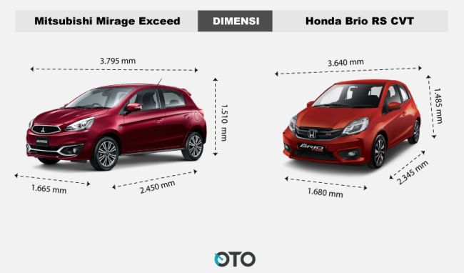 Dimensi Mirage lebih panjang dan tinggi dari Brio, hanya lebih lebar sedikit saja. Keduanya menunjukkan postur yang sangat mungil dan kompak. Lebih pas dijadikan sebagai mobil perkotaan. Luas kabin mudah terbaca, Mirage-lah yang lebih unggul. Ruang penumpang belakang mirip tapi lebih luas Mirage sedikit.Begitu pula dengan bagasi, Brio tak mampu menyamai kapasitas Mirage. Jika sering membawa barang banyak, Mirage dirasa lebih pas ketimbang Brio.
