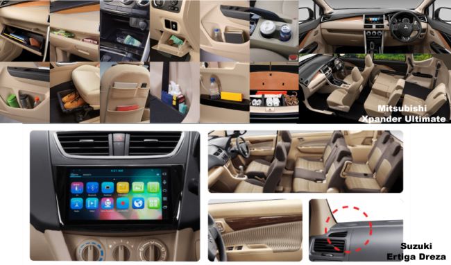 Desain interior keduanya ternyata mirip. Sama-sama menggunakan skema dua warna, krem dan hitam. Salah satu poin plus dari kabin Xpander, banyaknya kompartemen untuk menyimpan atau menyelipkan barang. Dreza juga punya tapi tak sebanyak Xpander. Karena lebih lega, kabin Xpander tentu lebih nyaman diokupasi penumpang. Untuk masuk ke dalam kabin, baik Xpander dan Dreza sudah mendukung keyless entry dan tombol Start/stop untuk menyalakan atau mematikan mesin.
