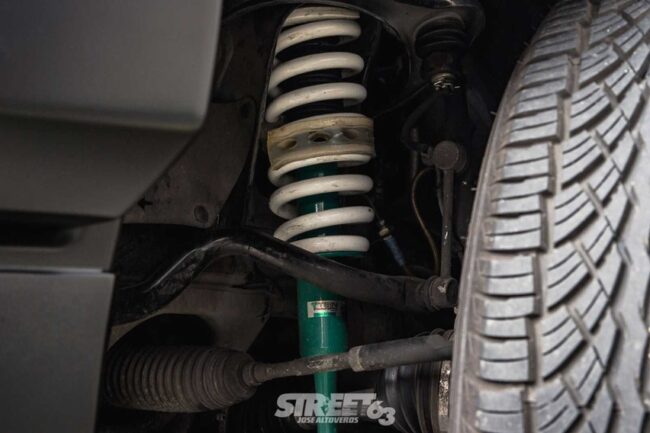 Shock absorber Tein Enduro Pro+ dengan spring KYB Xtage 40 mm dipilih. Setelannya sedikit diubah, sehingga kesan ceper kentara. Rupa tangguh tak dihilangkan pada sektor kaki-kaki. Pelek Stealth Custom Series F5 berukuran 17 inci dan berwarna gelap dipasang ke empat sisi. Palang tebalnya berpadu apik bersama ban Falken ZIEX STZ berkonfigurasi 275/65. Corak tapaknya cocok untuk melekat ke jalan aspal perkotaan. Sementara sistem pengereman bawaan diganti dengan MaxSpeed 355 enam piston di balik roda.