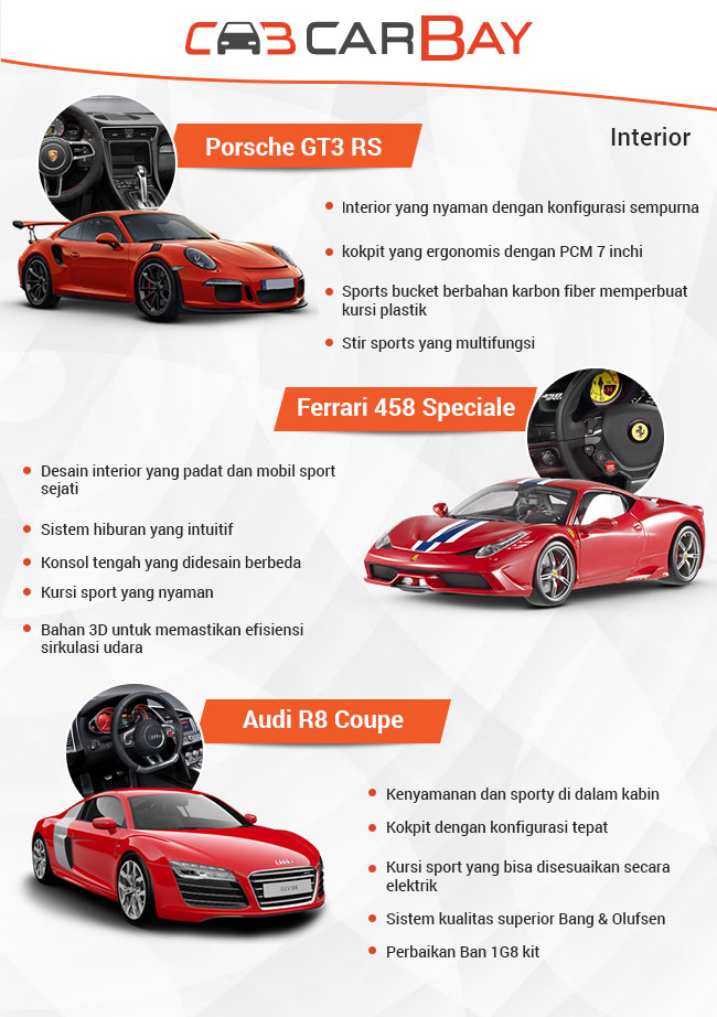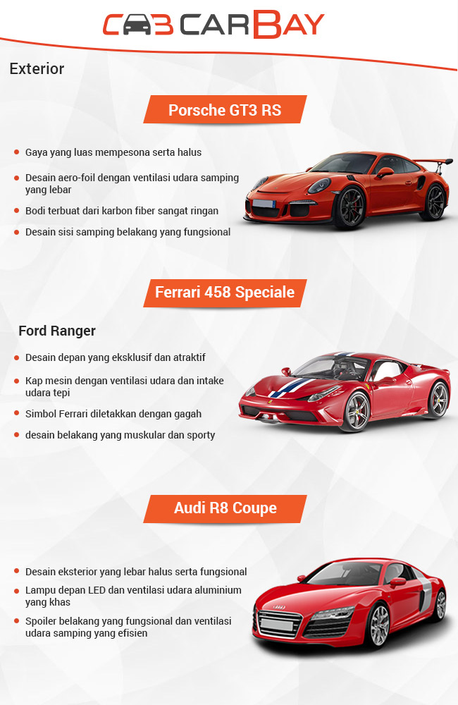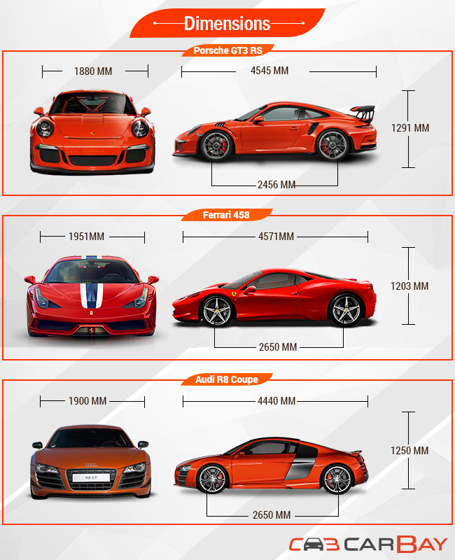 Keseluruhan mobil sport menunjukan kemampuan dinamis yang garang dan memiliki proporsi tipe mobil sport sejati. Porsche, yang dikenal akan stylingnya mendesain New Porsche 911 GT3 RS untuk membuat orang terpana dan memberikan akselerasi yang kompetitif. Fitur efisiensi yang disajikan oleh tiga mobil sport ini juga hampir sama.