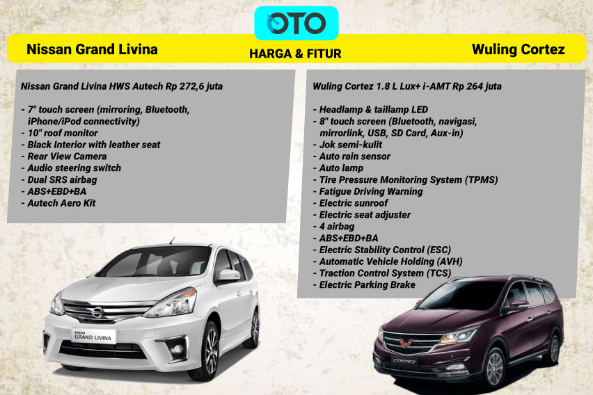 Tak perlu memperbandingkan fitur Grand Livina dengan Wuling Cortez, karena memang tidak sebanding. Lebih murah Rp 8 juta bukan sebuah kerugian bagi Wuling membanjiri Cortez dengan fitur menarik. Bahkan banyak fitur yang biasanya hanya ada di mobil seharga Rp 400 jutaan. Jadi, Cortez pantas menyombongkan diri. Tapi, Grand Livina Autech punya sesuatu yang tidak ada di Cortez, yaitu material kulit lebih mewah yang membungkus jok, dan monitor plafon berukuran 10-inci untuk hiburan penumpang belakang.