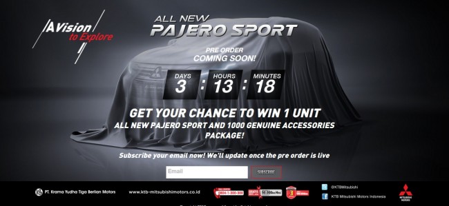 JAKARTA: Bersiap melakukan debutnya di Indonesia tahun ini, Mitsubishi Pajero Sport terbaru sudah mengumumkan tahap pre-order yang akan dimulai pada 17 Januari 2016. Diungkap pada teaser trailer dari pabrikan mobil asal Jepang tersebut, Pajero Sport 2016 tidak hanya menampilkan perubahan desain yang signifikan namun juga akan mengusung mesin terbaru dengan transmisi otomatis 8-speed. Persaingan antara pabrikan otomotif semakin meruncing di Indonesia karena pemimpin pasar saat ini, Toyota juga sudah mengumumkan rencana peluncuran Fortuner 2016 terbaru mereka. Situs resmi Mitsubishi Motors untuk Indonesia juga sudah memasang penghitung waktu mundur sebelum Pajero Sport terbaru tersedia untuk pre-order.