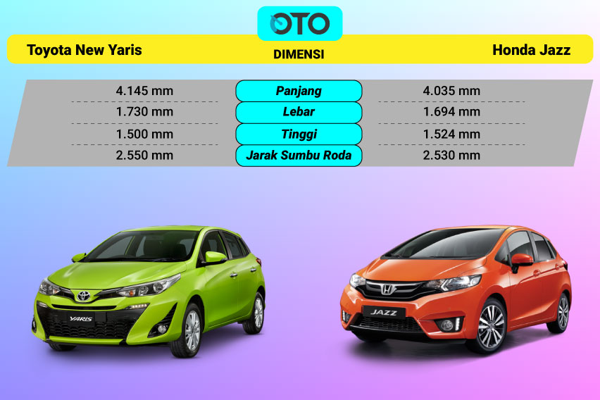 Yaris baru punya dimensi 4.145 x 1.730 x 1.500 mm (PxLxT) dan jarak antar sumbu roda 2.550 mm. Sementara Honda Jazz 4.035 x 1.694 x 1.524 mm serta dengan wheelbase 2.530 mm. Dimensi keseluruhan Yaris baru lebih besar ketimbang Jazz, sedang kabin keduanya kurang lebih sama leganya, meski secara jarak sumbu roda lebih panjang Yaris.