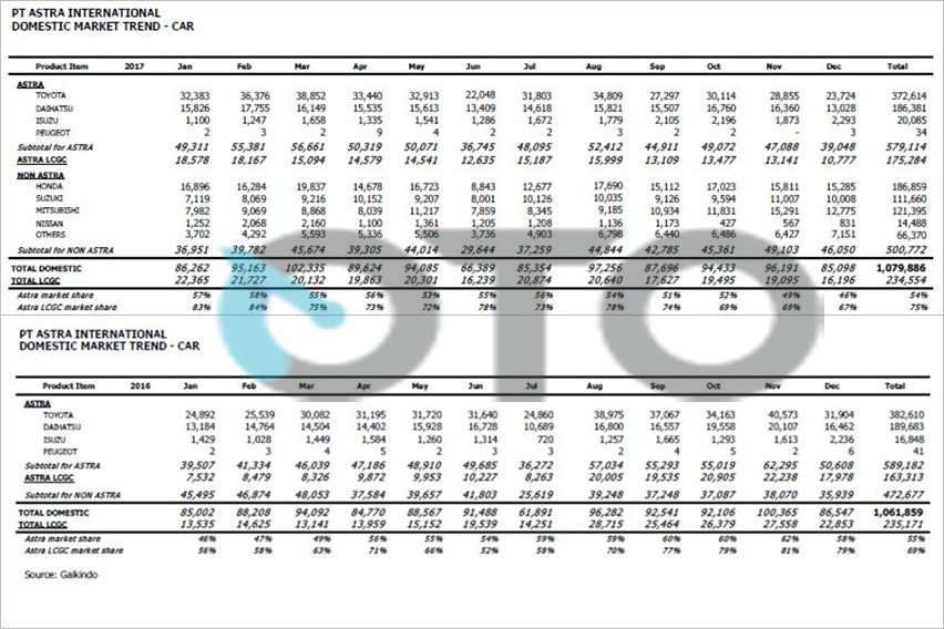 Cukup mengejutkan, padahal sinyalemen positif sempat terjadi di akhir musim penjualan 2017. Secara total market otomotif domestik Indonesia, menghasilkan transaksi atas 1.079.886 unit. Terjadi kenaikan dari periode sebelumnya (2016) di level 1.061.859 unit. Sementara di periode tersebut, grup Astra berhasil berkontribusi atas 55% penjualan.