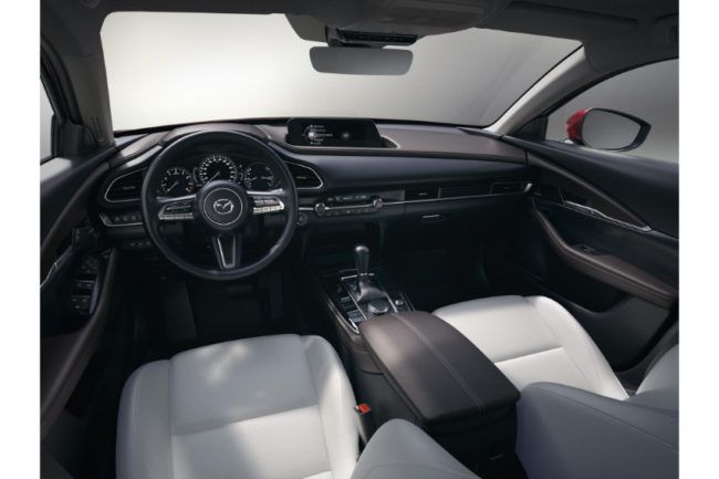 Masuk ke kabin, desain dasbor menyerupai Mazda3 baru. Hanya saja, ada sedikit perbedaan pada bagian atasnya. Kelengkapannya masih khas Mazda, termasuk layar infotainment 8,8 inci mencuat di tengah dasbor. Sistem MZD Connect didukung 8 speaker atau 12 speaker lansiran Bose. Sedang dari fitur safety, CX-30 dibekali 7 kantong udara dan paket Mazda i-Activsense yang terdiri dari Driver Monitoring System, Front Cross Traffic Alert dan Cruising & Traffic Support. Fitur itu juga sama seperti yang dipunya Mazda3 anyar.
