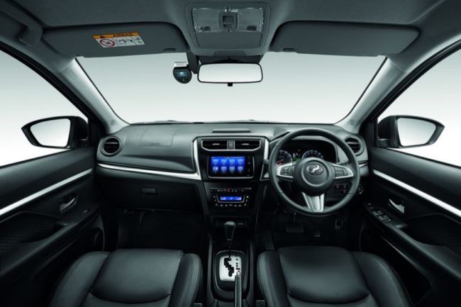Melongok ke dalam, banyak sekali bedanya dengan Rush-Terios lokal. Desain dasbor menyerupai MyVi beserta tombol AC digital yang sangat mirip. Bagi kami justru lebih menarik, karena tidak ada hiasan jahitan di sepanjang dasbor. Varian atas sudah terbalut kulit di seluruh jok, mendapat lampu LED otomatis, fungsi SmartLink pada head unit, Driving Video Recorder (DVR) dan SmartTAG terintegrasi.