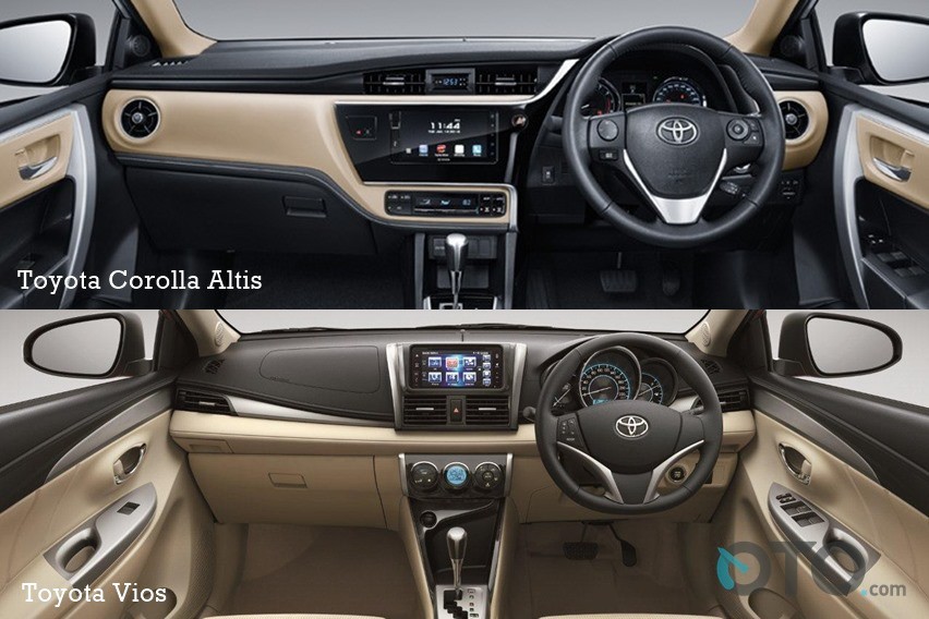 Sementara Vios tertinggi dilengkapi bodykit ala TRD sebagai pendongkrak penampilan eksterior. Di dalam kabin AC sudah digital otomatis dan layar sentuh sebagai infotainment yang tergolong lengkap. Bisa memanfaatkan gesture command dan internet juga seperti pada Altis. Vios tertinggi juga sudah menggunakan Smart Start/Stop System. Sedang kursinya belum dibungkus kulit. Kabin lumayan elegan karena skema dua warna, dengan warna krem mendominasi. Soal safety, Altis lebih lengkap dari Vios. Keduanya sama-sama dibekali dual SRS Airbags dan rem ABS+EBD. Altis masih ditambah dengan vehicle stability control dan sensor parkir mundur.